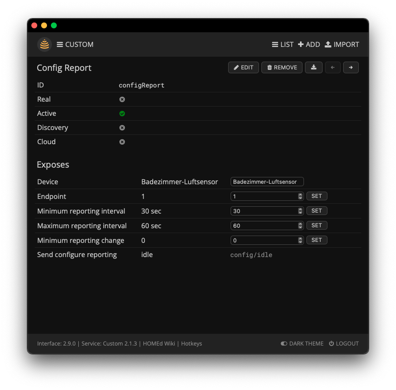 xyzroe Данная автоматизация позволяет быстро настраивать параметры отчётности (reporting) для любых Zigbee-устройств прямо из интерфейса HOMEd. Реализованные возможности: Выбор устройства, endpoint и настройка параметров отчётности через UI HOMEd Автоматическое создание/обновление служебного устройства Config Report после каждого обновления списка Zigbee-устройств Отправка команды setupReporting в Zigbee-сервис для применения параметров ко всем атрибутам выбранного endpoint через свойство config в устройстве Config Report Требования: HOMEd Zigbee HOMEd Web HOMEd Custom HOMEd Automation ⚠️ Внимание! Изменение параметров отчётности (reporting) может привести к некорректной передаче данных от вашего устройства. Все изменения вы производите на свой страх и риск. Разработчик HOMEd не рекомендует изменять параметры отчётности, а использовать значения по умолчанию. Установка На вкладке Automation импортируйте файл auto-config-report.json auto-config-report.json5kB Активируйте автоматизацию и сохраните Проверьте на вкладке Custom устройство Config Report: Если не появилось, то после включения автоматизации достаточно нажать Permit Join на вкладке Zigbee (можно сразу отключить) Использование При обновления списка Zigbee-устройств обновляется устройство Config Report. Если не обновилось, то после включения автоматизации достаточно нажать Permit Join на вкладке Zigbee (можно сразу отключить) В этом устройстве можно: Выбрать нужное Zigbee-устройство Указать желаемых endpoint Задать минимальный и максимальный интервалы отчётности, а также минимальное изменение значения для отправки отчёта При нажатии на свойство config отправляется команда на Zigbee-сервис, параметры применяются ко всем атрибутам endpoint Система с несколькими экземплярами служб Если используется несколько экземпляров Zigbee-службы, измените в 1-м trigger и 3-м action MQTT-топик на: homed/status/zigbee/имя_экземпляра Если используется несколько экземпляров Custom-службы, измените во 2-м action MQTT-топик на: homed/command/custom/имя_экземпляра Примечания Для изменения параметров отчётности устройства, работающего на батарейках, необходимо как предварительно, так и сразу после отправки команды, будить устройство кнопкой. Применения параметров отчётности происходит ко всем атрибутам выбранного endpoint, возможность указать конкретный атрибут отсутствует. Автоматизация реагирует на каждое сообщение Zigbee — включайте её только при необходимости, чтобы не создавать лишнюю нагрузку на систему. Автор идеи и первичной реализации @Oleg aka @Novgorod_DIYZi. Выражаю ему признательность за проведённые тесты.